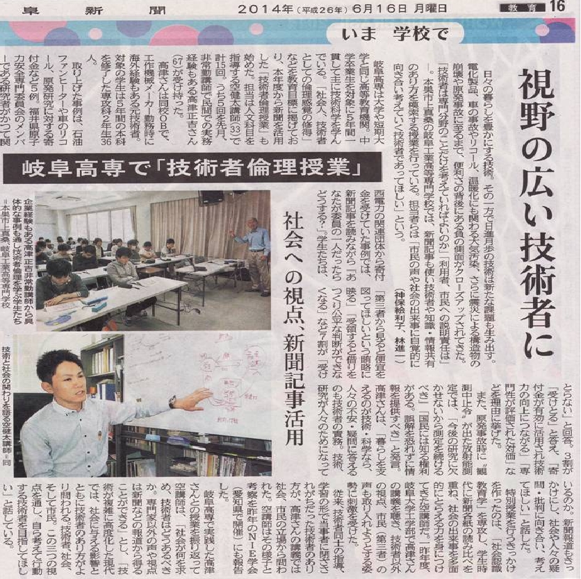 岐阜高専・専攻科の「技術者倫理授業」について2014年6月16日の岐阜新聞に掲載された記事を紹介します。